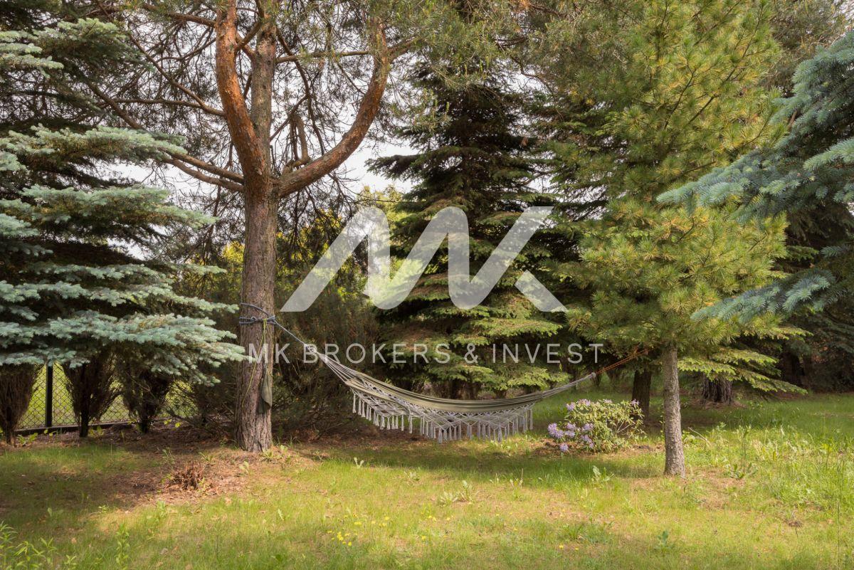 Działka: 2.350 m² – w pełni zagospodarowana, z dużymi drzewami (sosny, świerki, buki), krzewami ozdobnymi i nasadzeniami