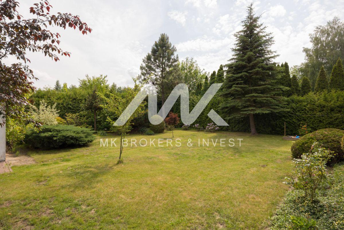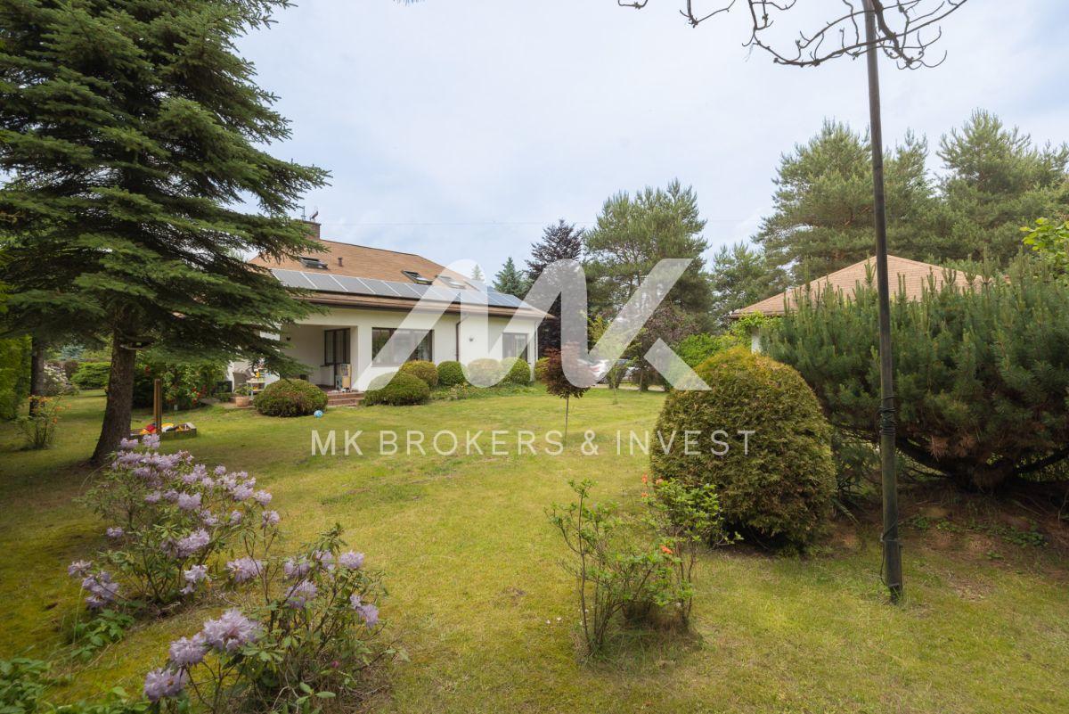 Działka: 2.350 m² – w pełni zagospodarowana, z dużymi drzewami (sosny, świerki, buki), krzewami ozdobnymi i nasadzeniami