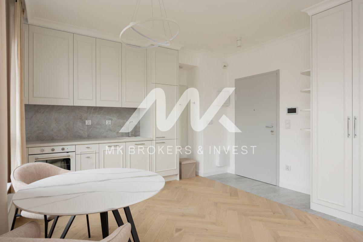 Apartament został zaprojektowany przez architekta z dbałością o wszelkie detale i estetykę. Mieszkanie jest funkcjonalne, widne dzięki dużym przeszkleniom, jasne, w pełni umeblowane: szafy w zabudowie na wymiar, kanapa, stolik kawowy i obiadowy, kuchnia wyposażona w sprzęt AGD (zmywarka, lodówka, płyta indukcyjna), w łazience pralko-suszarka.