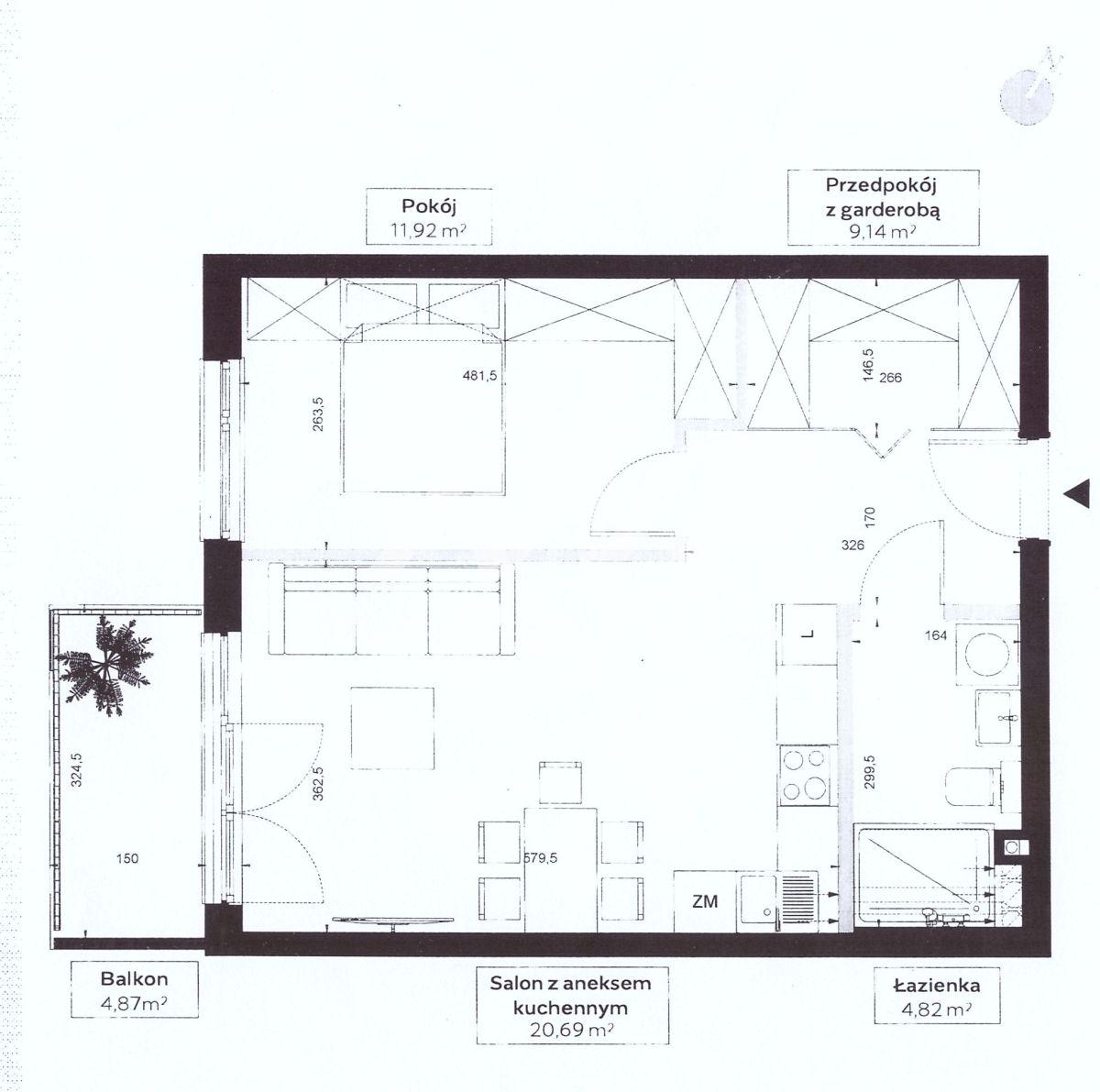 Powierzchnia: 46,57 m² + balkon 4,87 m²