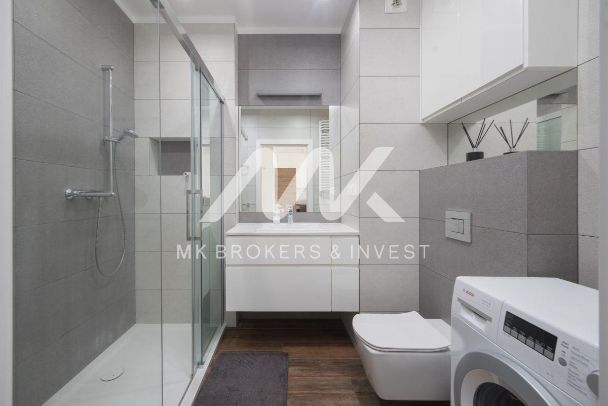 Łazienka: Nowoczesna łazienka z prysznicem, utrzymana w eleganckim stylu.