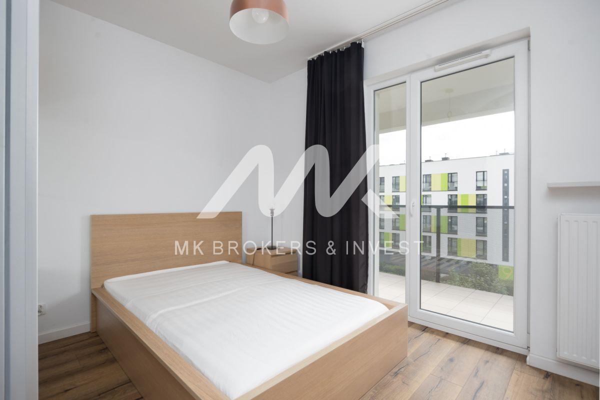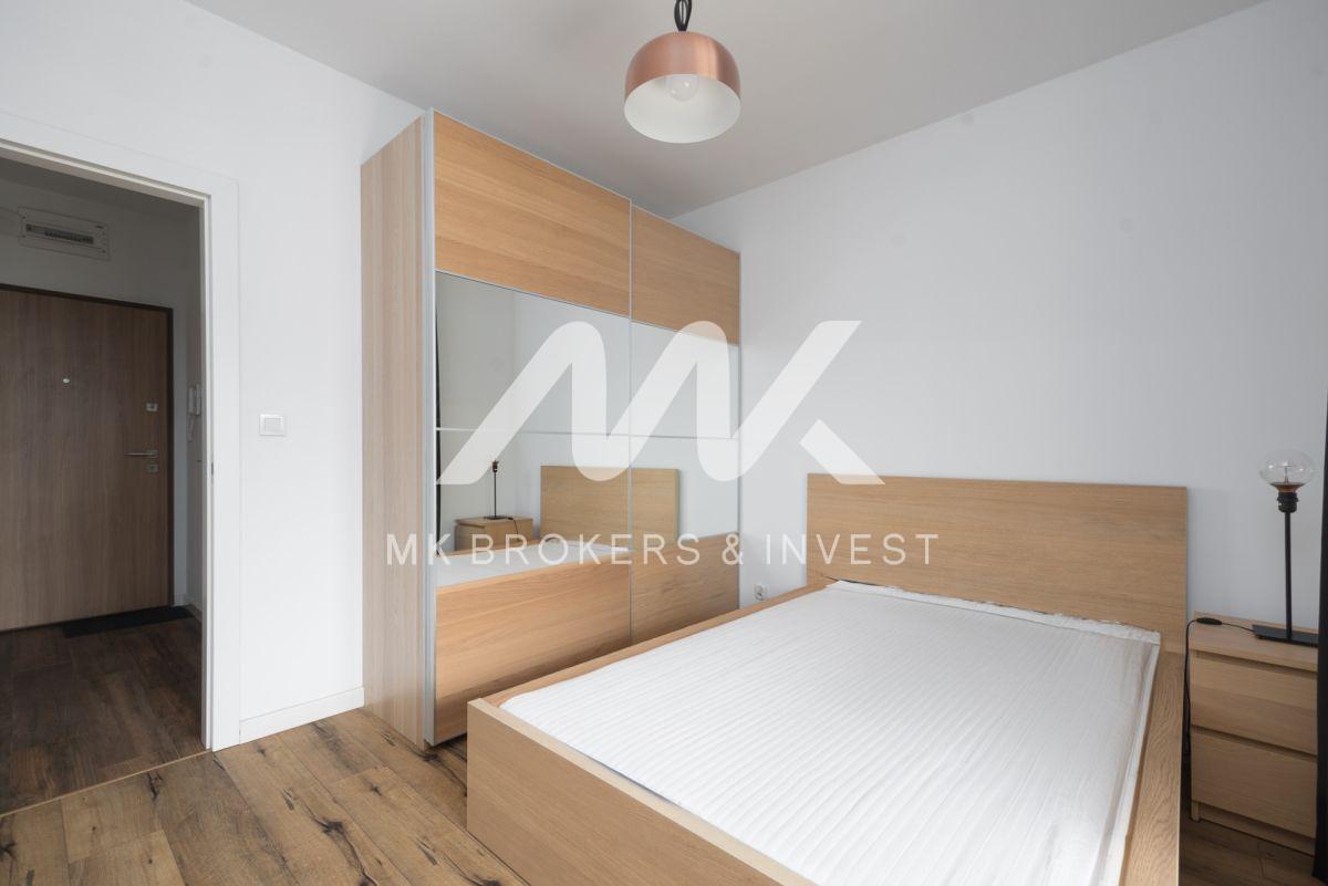 Sypialnia: Komfortowa sypialnia z dużą szafą i łóżkiem z funkcją przechowywania, również z wyjściem na loggię.
