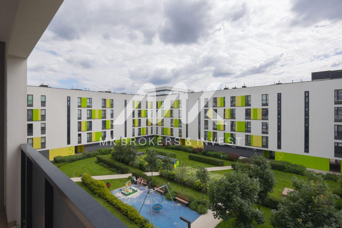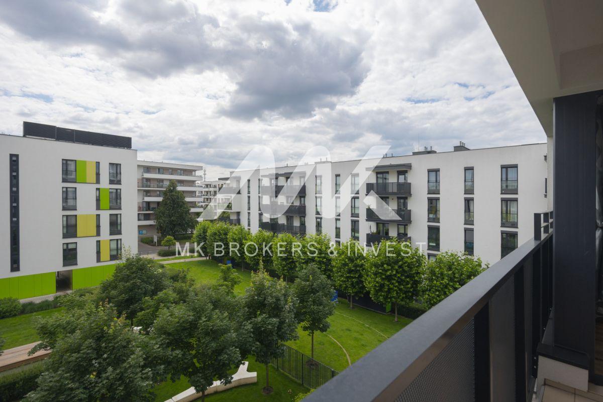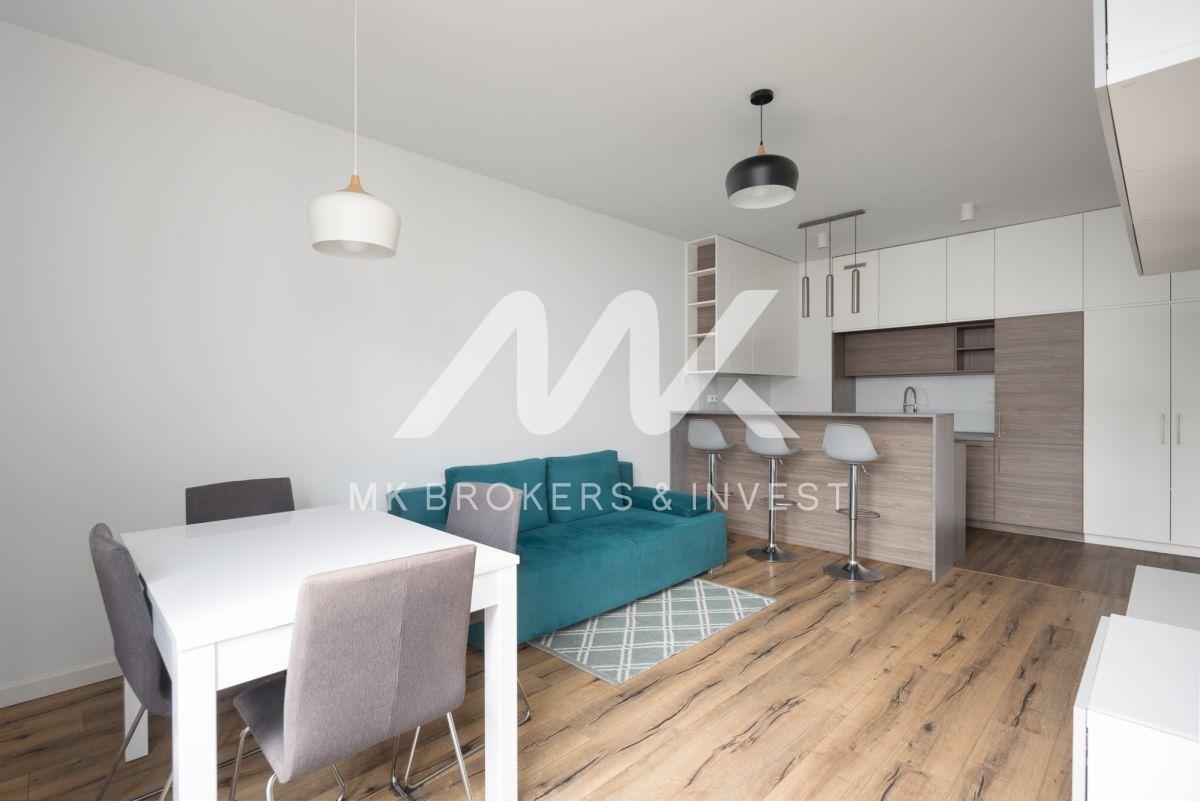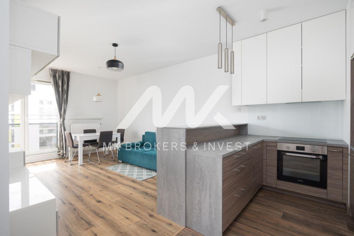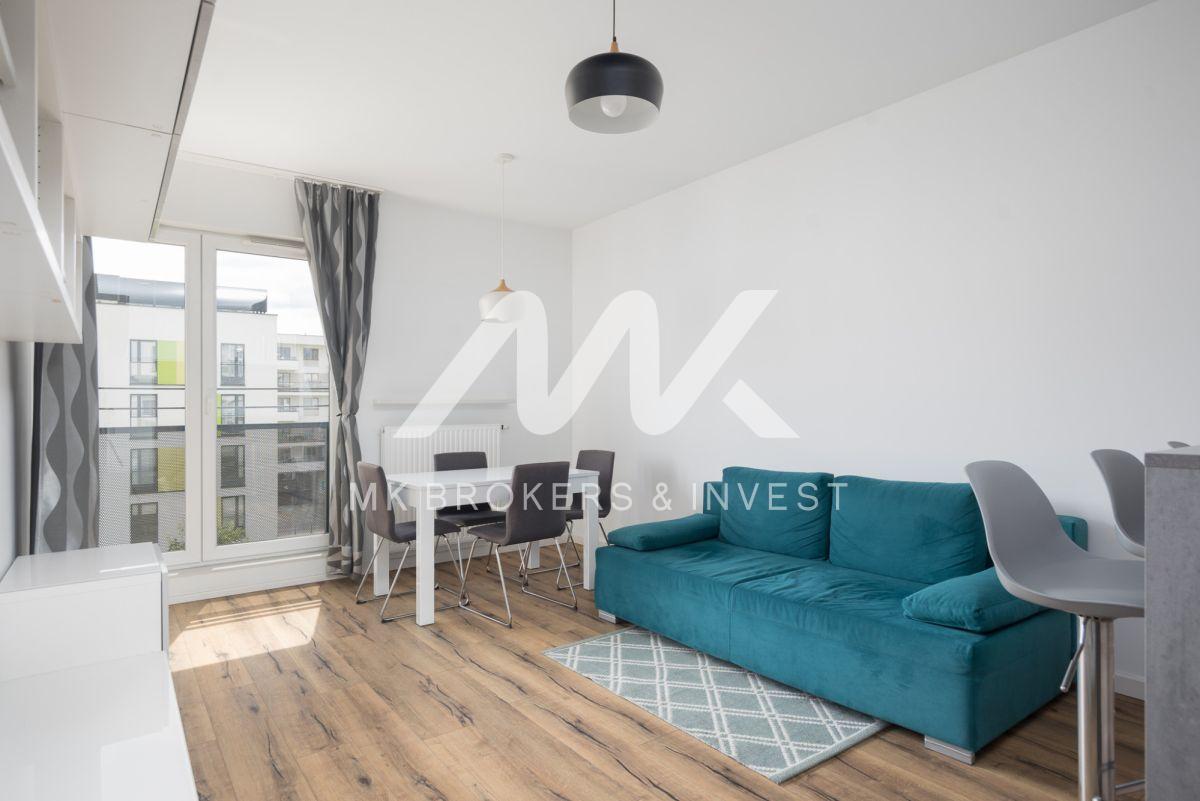 Salon z Aneksem Kuchennym: Przestronny salon z aneksem kuchennym, w pełni umeblowany i wyposażony w nowoczesne sprzęty AGD. Z salonu jest bezpośrednie wyjście na loggię, skąd roztacza się widok na zielone patio wewnątrz osiedla. Ekspozycja okien na południowy zachód gwarantuje mnóstwo naturalnego światła przez cały dzień.