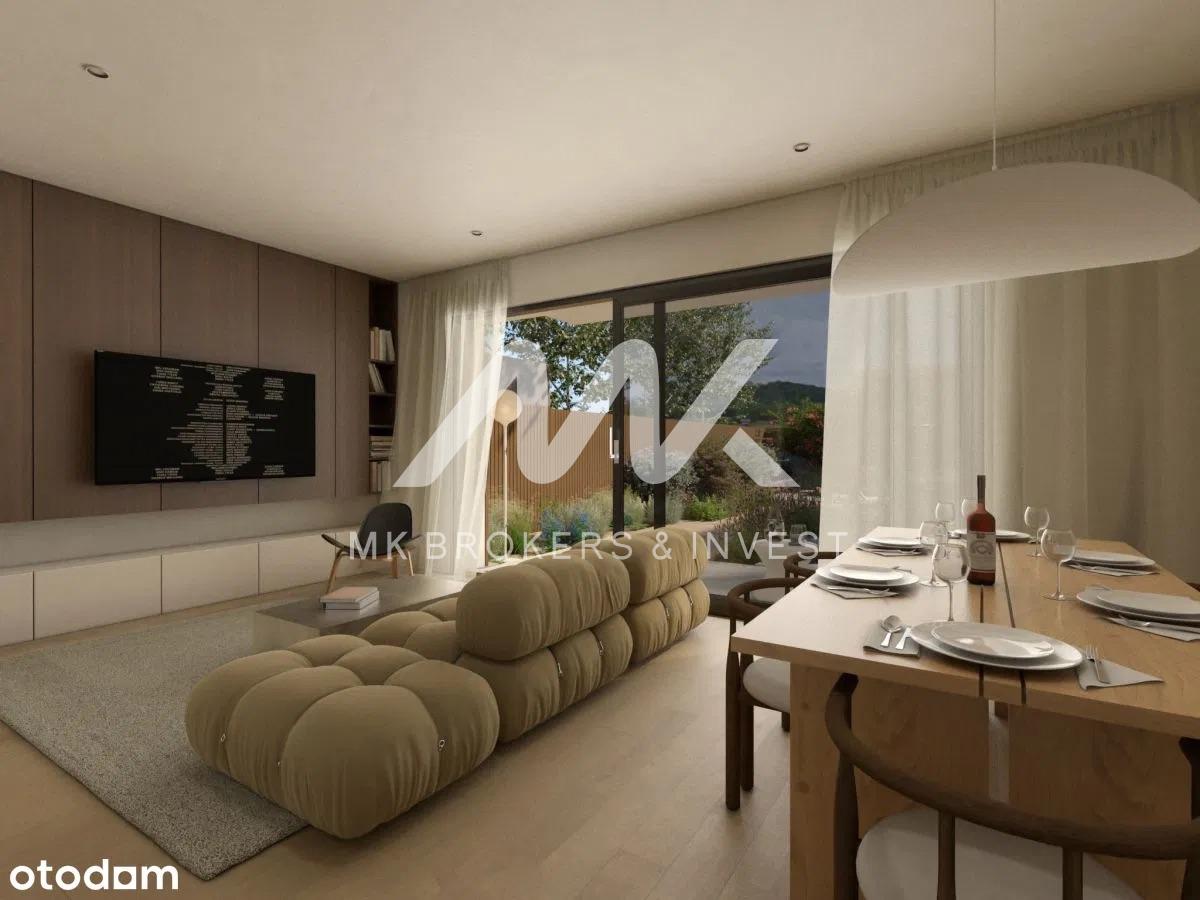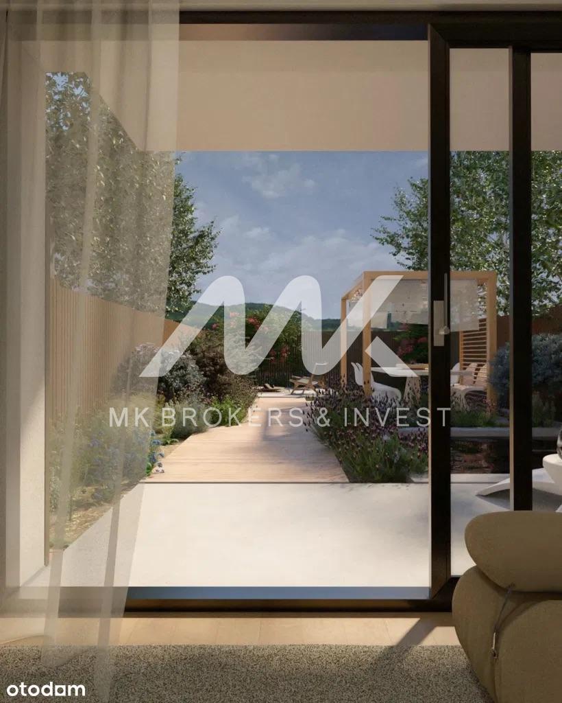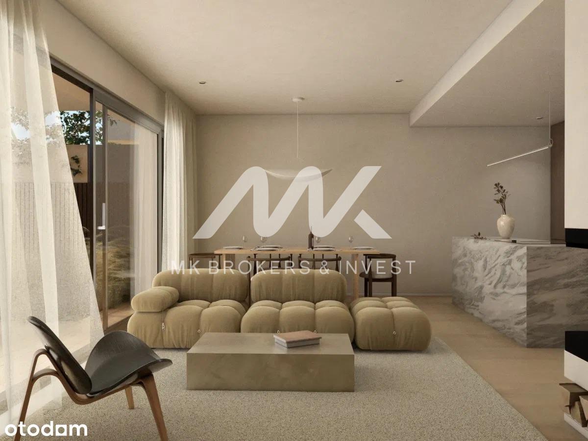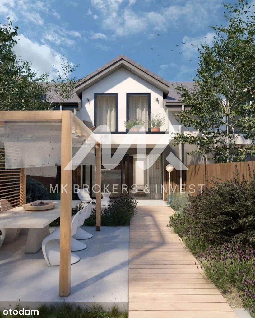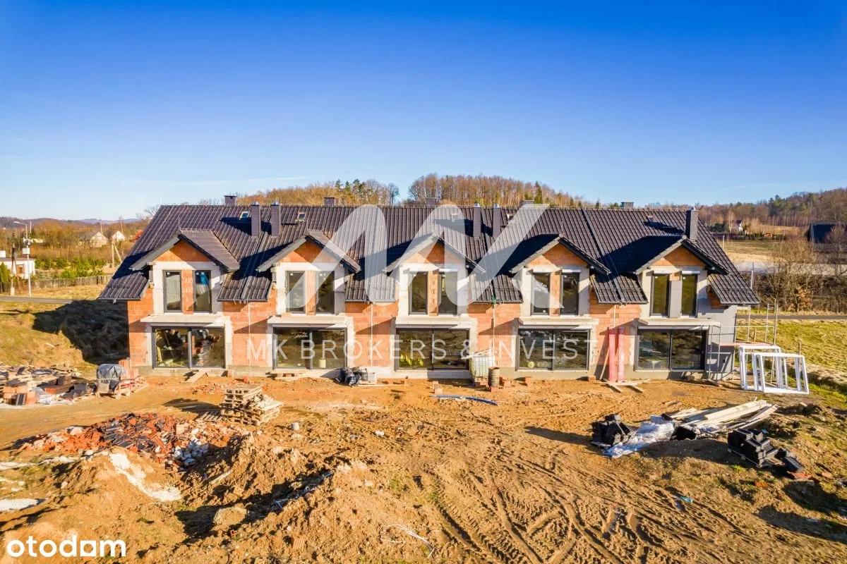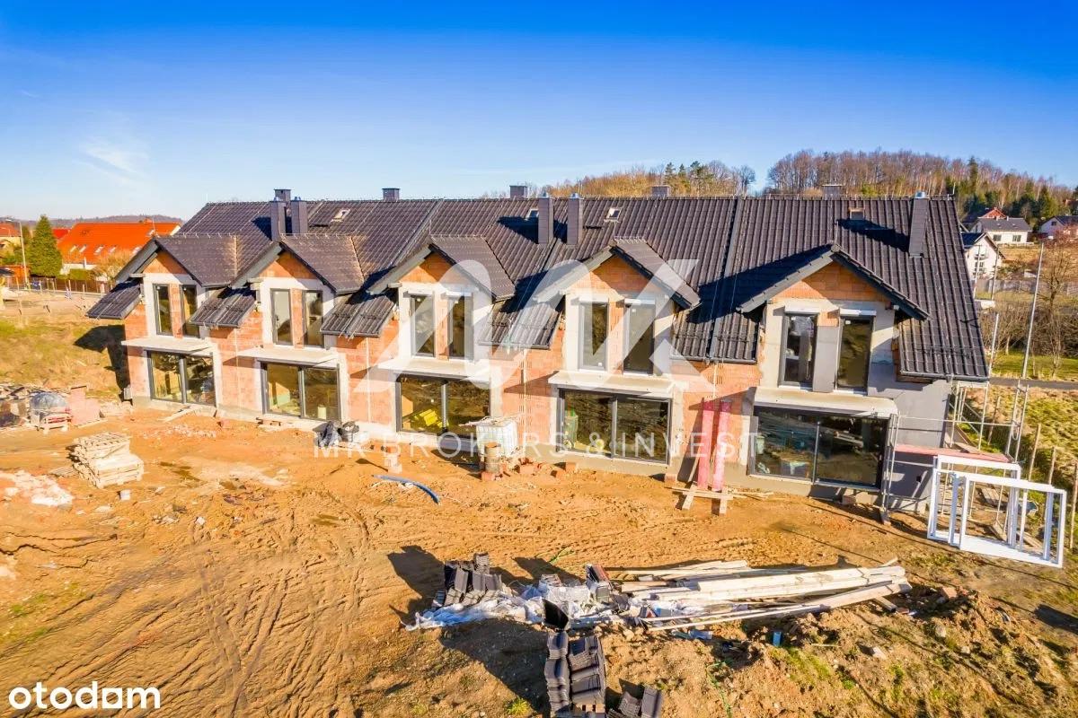 Architektura tych domów jest prawdziwym arcydziełem, łącząc nowoczesne wykończenie elewacji z subtelnymi elementami naturalnego drewna. Kontrastowe tynki harmonijnie współgrają z drewnianymi okładzinami, tworząc niepowtarzalny i stylowy wygląd. Już na pierwszy rzut oka przyciąga uwagę praktycznie zadaszona strefa wejściowa oraz oryginalna rama wokół garażu, dodając niepowtarzalnego charakteru każdemu z domów.