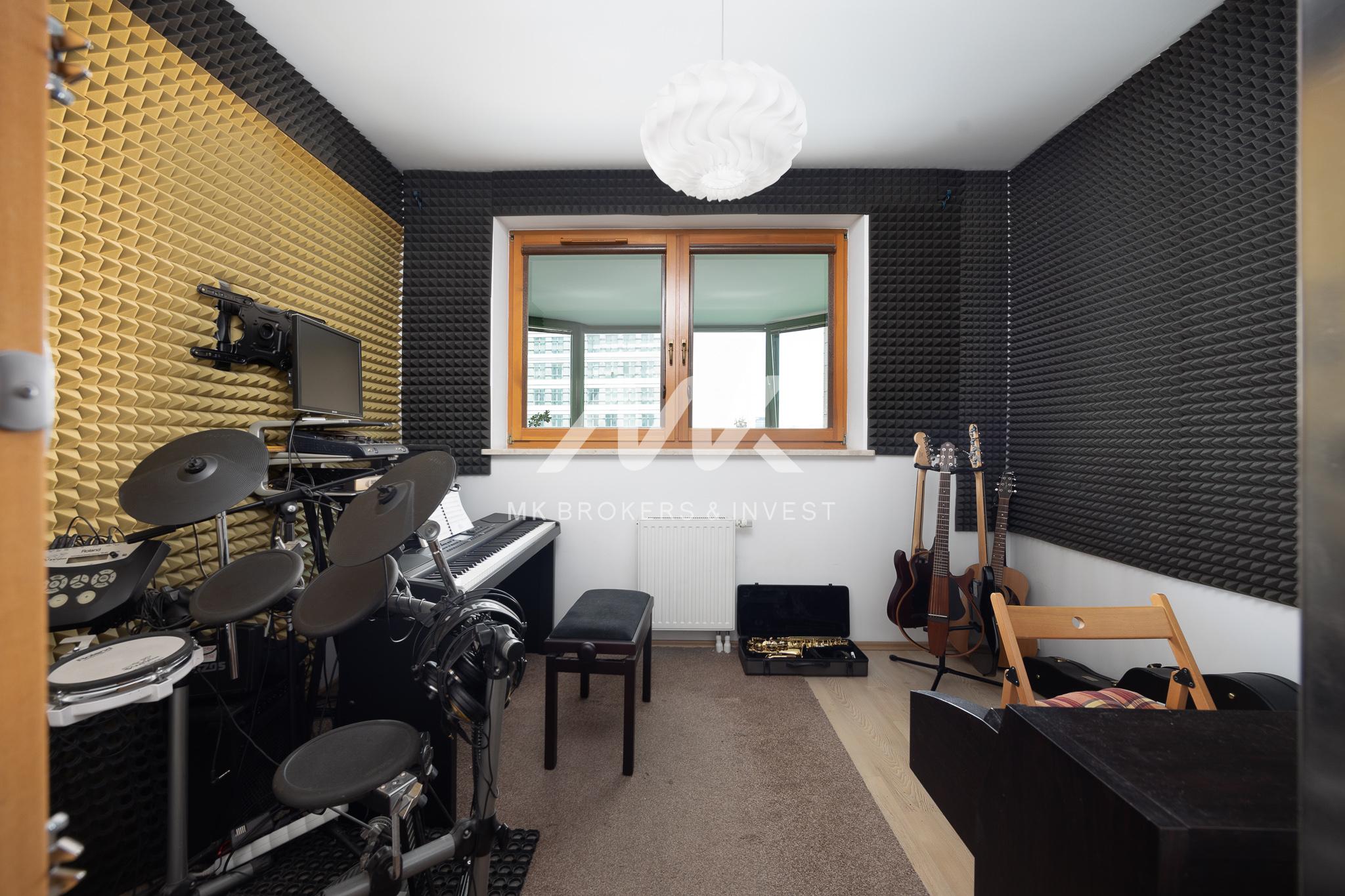 • Pokój (10 m²), idealny na gabinet lub sypialnię, obecnie zaaranżowany jako pokój muzyczny z wygłuszonymi ścianami,